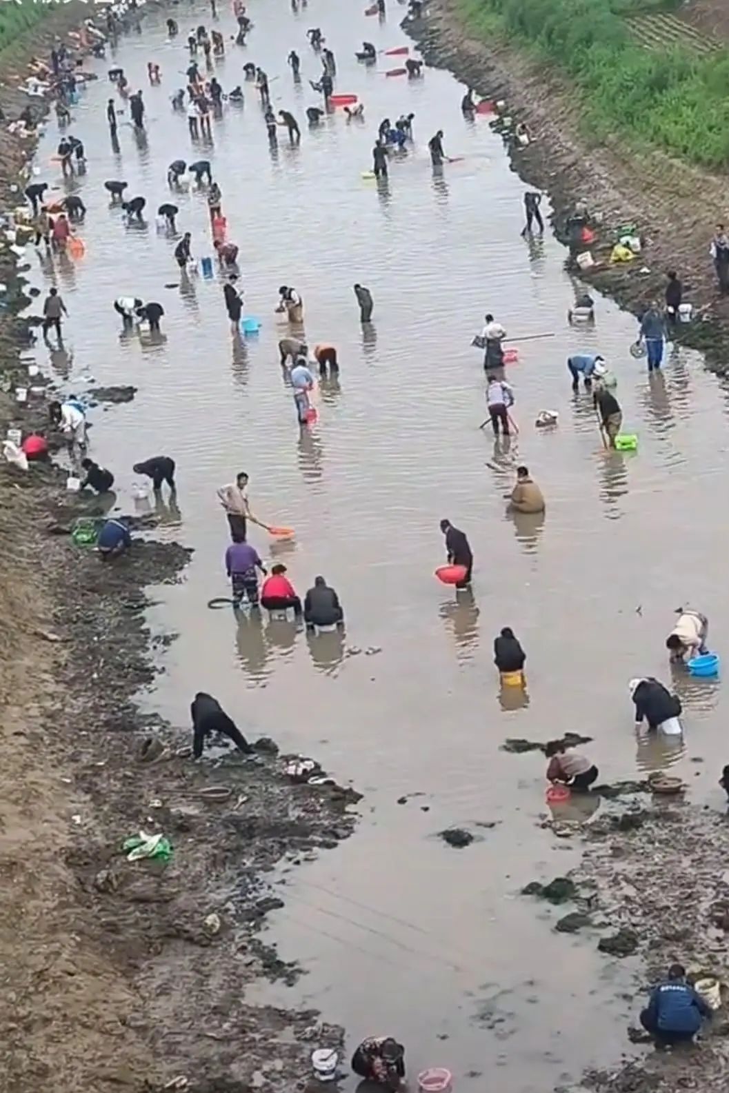 视频显示,一河流河水不深,不少人员蹲在河里,拿着工具在水里捞东西。有网民称有人下河摸金摸铜钱。